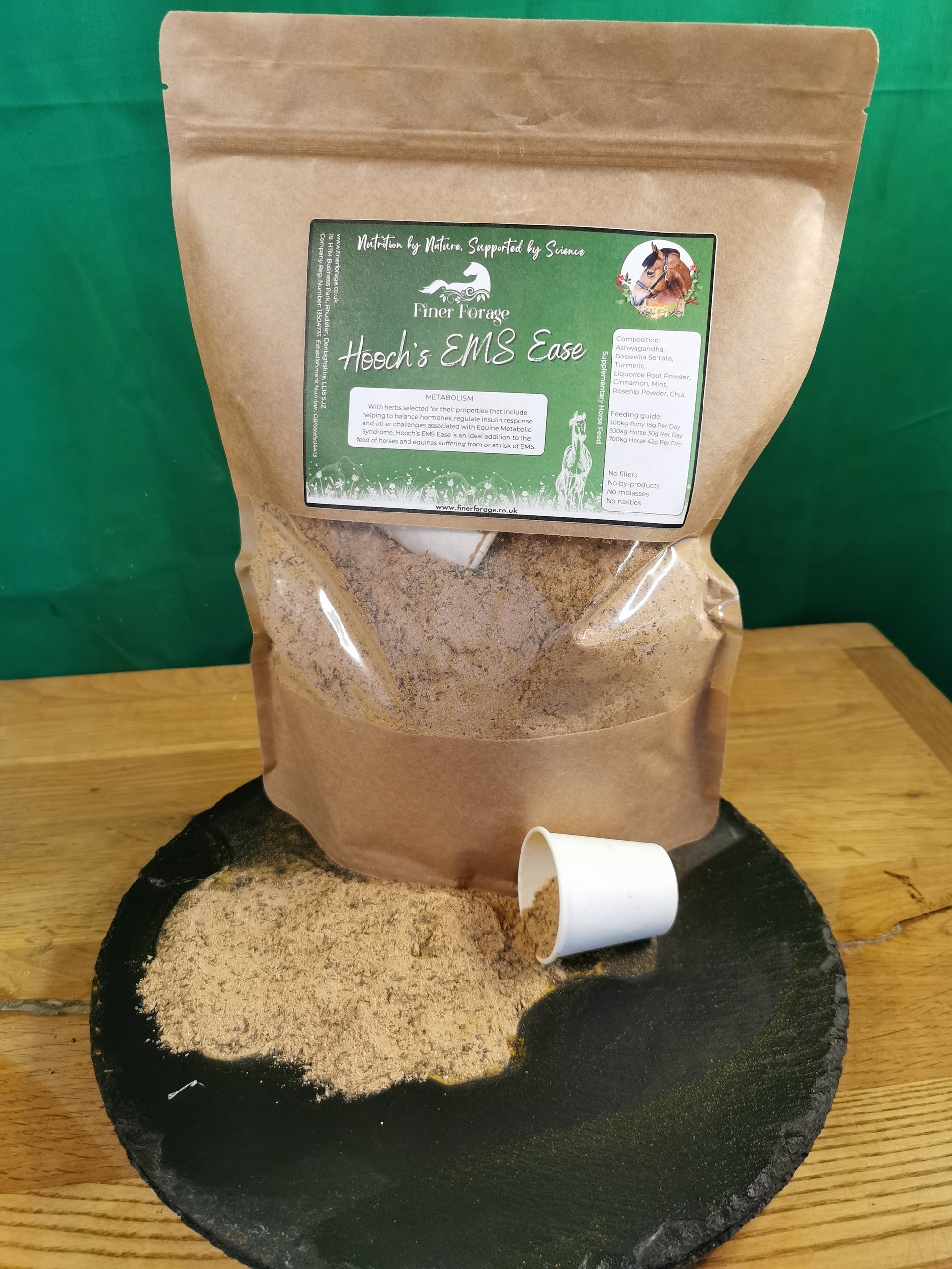 Hooch's EMS Ease is a blend of herbs that help balance the hormones, regulate the insulin response and support the myriad of challenges that come with Equine Metabolic Syndrome. For horses and ponies who suffer from, or at risk of EMS or similar: EMS Ease is the perfect herbal blend.