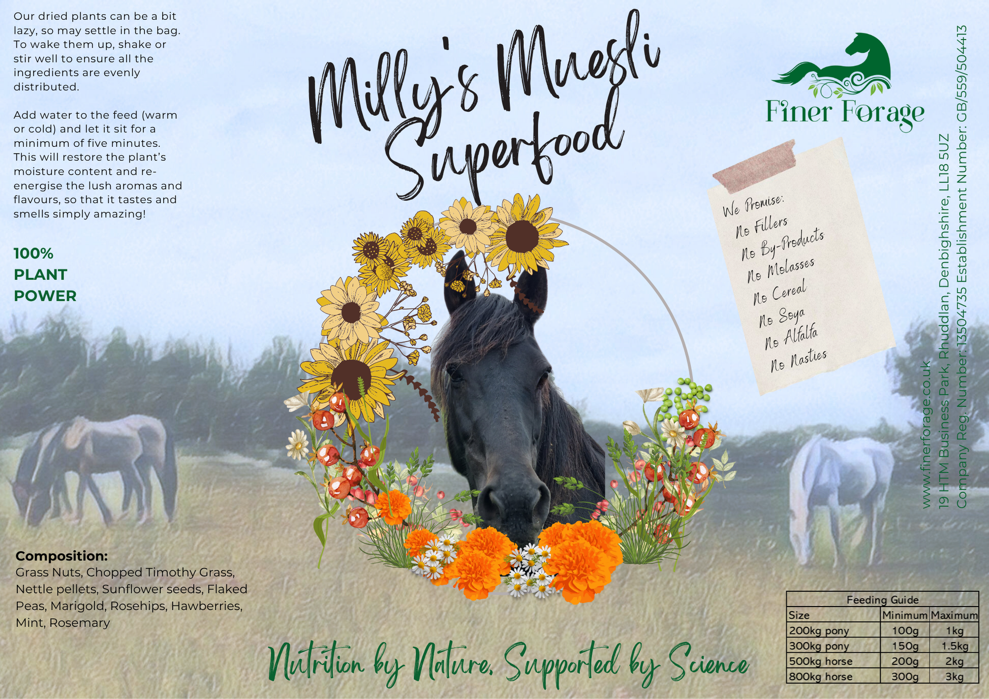 Milly's Muesli Superfood - LIMITED EDITION features a carefully selected blend of ingredients designed to provide comprehensive nutritional support for horses. This premium mix includes grass nuts and chopped Timothy grass, offering a natural source of fibre and energy. Nettle pellets contribute essential minerals, while sunflower seeds and flaked peas supply valuable oils and protein to support muscle function and overall vitality. The inclusion of botanicals such as marigold, rosehips, hawthorn berries, mint, and rosemary adds antioxidant properties and supports digestive health. Together, these ingredients create a balanced, nutrient-rich muesli that promotes sustained energy and wellbeing in horses with higher nutritional demands.